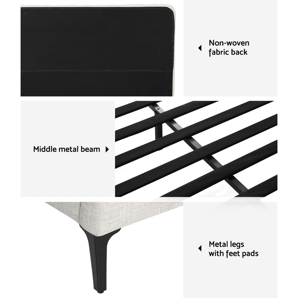 Add a touch of cosiness to your bedroom with our Marlook AMMY Bed Frame. Wrapped in premium faux linen fabric, the bed frame is aesthetically pleasing and extremely pleasant and smooth to the touch. The non-woven fabric is incredibly breathable to prevent moisture and bacteria build-up. The gorgeous cream shade enables you to style it in any bedroom, and it'll seamlessly blend into your home decor. The bed frame comes attached with a textured bed head and matching bed foot for a cohesive aesthetic. It has high-density foam padding, which makes it a cosy spot to sit back and relax, watch a movie, or read a book. Furthermore, the wide wooden slatted base provides a sturdy foundation and allows for proper ventilation for a fresh and dry mattress always. This bed frame has premium heavy-duty metal fixings and solid powder-coated steel legs, so you don't have to worry about stability. The bed frame is available in king and queen and fits Australian standard-size mattresses. Experience the sweetest dreams with the Marlook AMMY Bed Frame today.