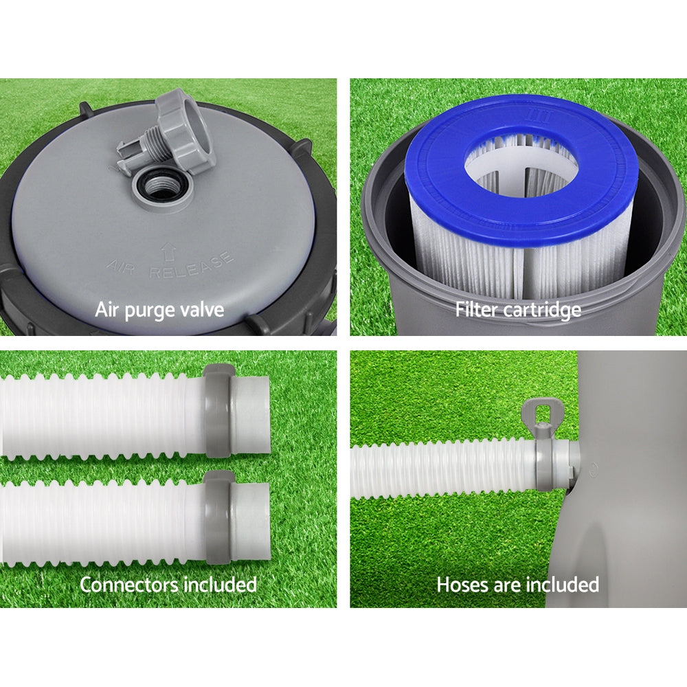 Designed to work specifically with Marlook above-ground swimming pools that use between 1,100 and 17,400 litres of water, the Marlook Filter Pump helps to filter and clean the pool water of dirt and contaminants. The pool water is pumped through a cartridge filter at a rate of 2006 litres/hour and returned filtered and cleaned. The pool system water flow rate is 530 gal/hour. Not least, an air purge valve helps to release air to prevent pressure build-up. Also included is a 10.6cm x 20.3cm filter cartridge and adaptors for pool valves.