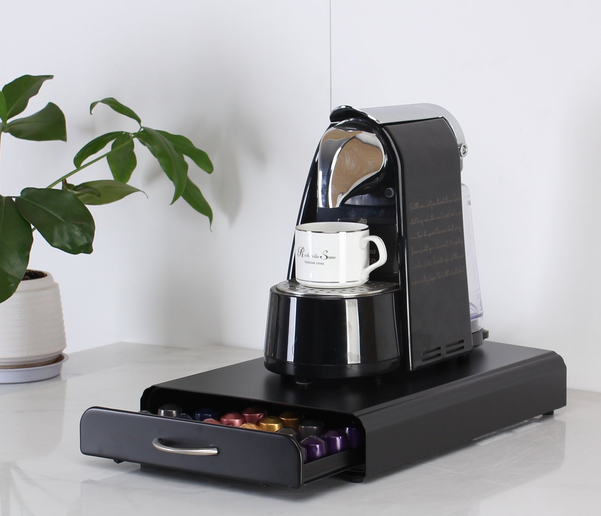 - Space saving and modern design: the size of 39 x 26 x 6.4 cm is suitable for home or office. This organizer combines the coffee machine and pods in one location, decluttering your space. The minimalist design adds a touch of elegance to your kitchen, office, or coffee shop.