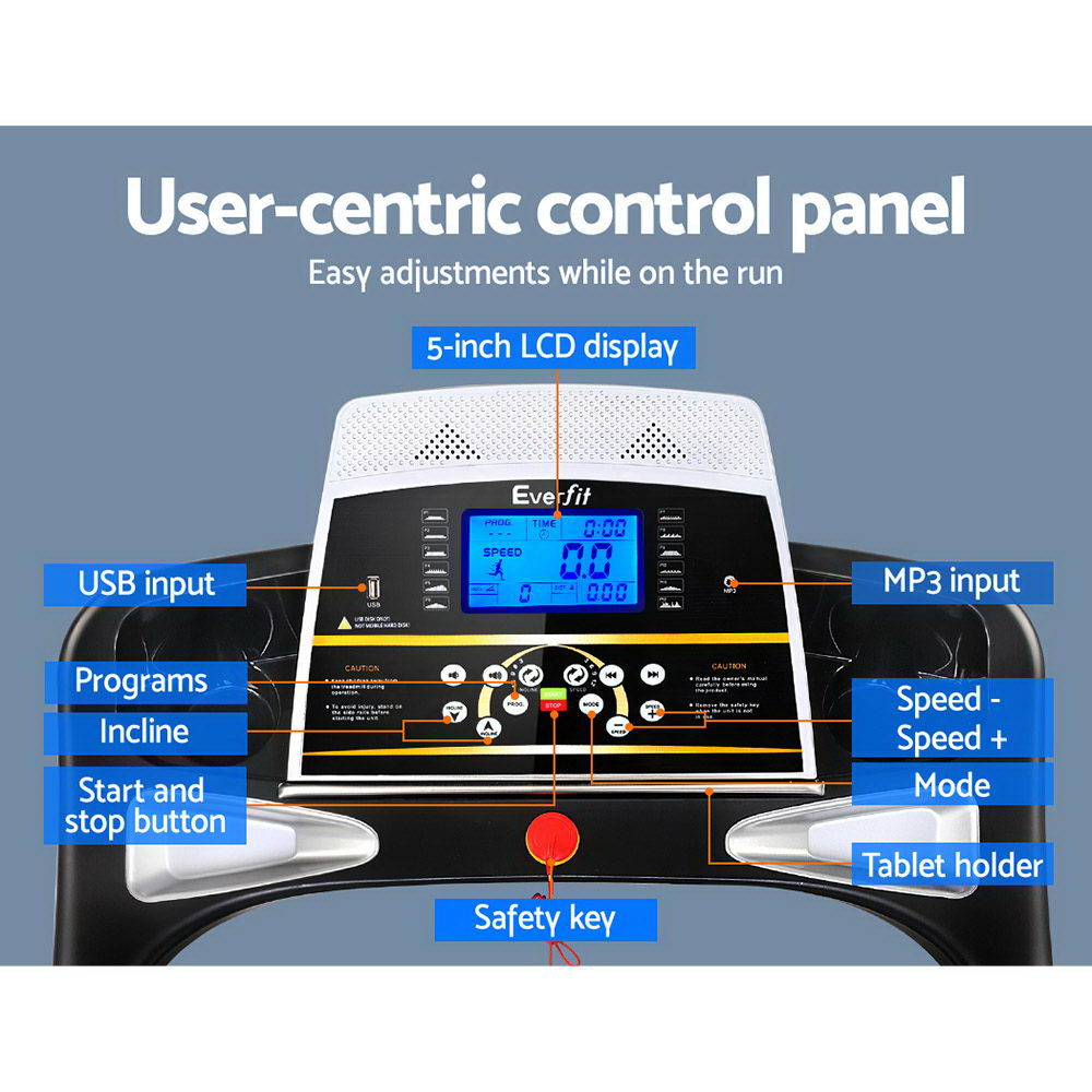 Compact and sturdy with its powder-coated steel frame, our Marlook Electric Treadmill allows you to perform essential cardio exercises within the comfort of your home. It features 12 pre-set training programs designed to simulate natural terrain. A user-centric control panel with a digital LCD display lets you set up to 18 speed levels and other monitoring parameters. Its powerful motor produces smooth and seamless operation and the anti-slip belt and soft-grip handlebar with pulse sensors make your session a comfortable and controlled experience. Other great features include a 15-level inclination adjustment, innovative double shock absorption system, automatic motor and belt lubrication, safety tether key, hydraulic fold-down for easy folding and storage, and smooth wheels for easy mobility. Not least, the treadmill is also equipped with USB and MP3 connection, twin speakers and dual drink holders to keep you entertained and hydrated. Best of all, the treadmill has a multifunctional workout system built in with a massage belt, sit-up bar and two dumbbells to allow for more fun and varied exercise.