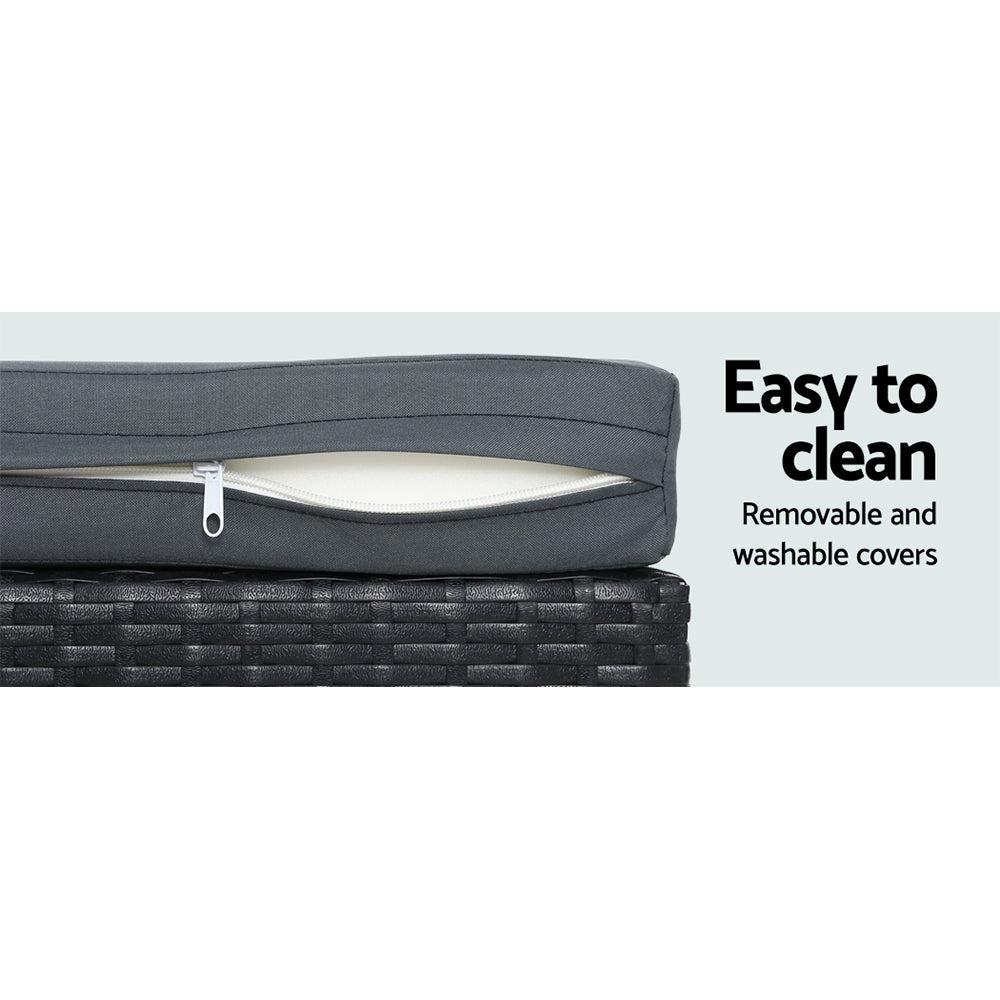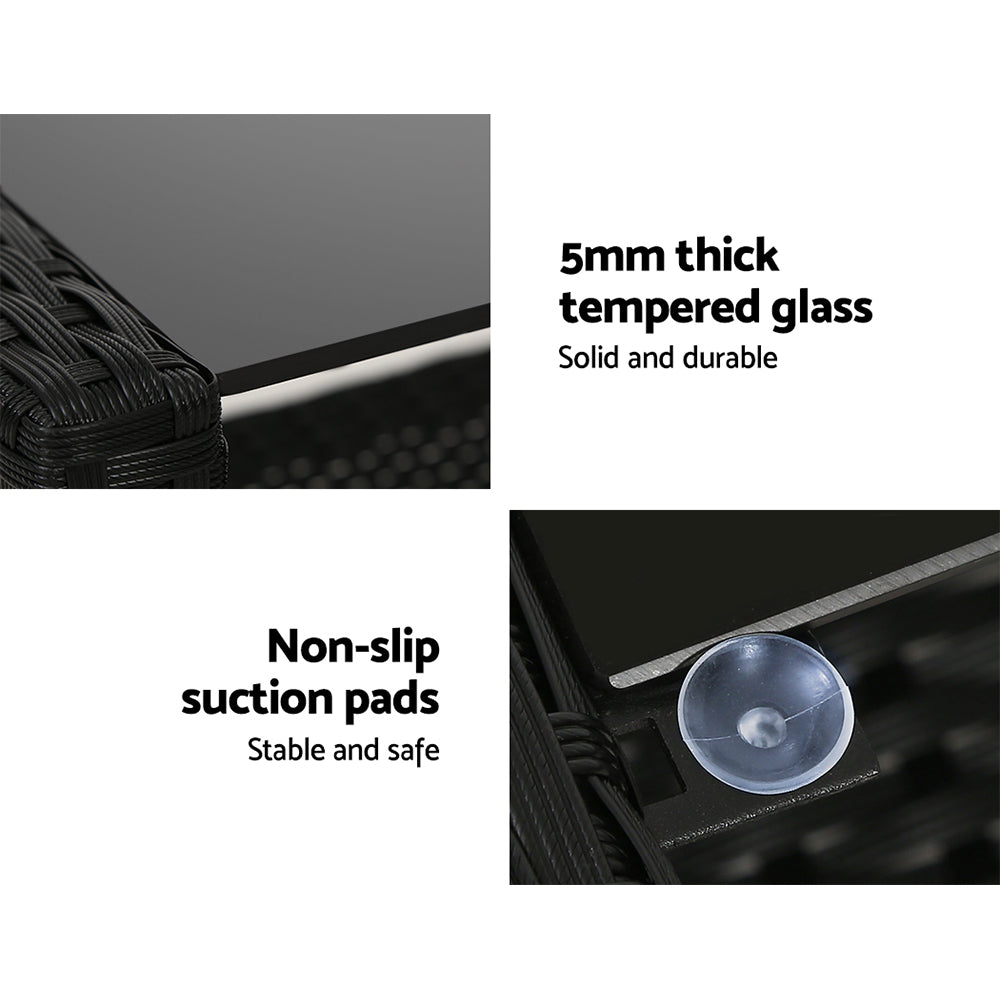 Meticulously crafted, our Marlook 4-piece Rattan Outdoor Set comprises two armchairs, a two-seater and a matching table for a beautiful integrated look. Its presence will definitely add panache and style to your deck, patio or even living room. Made of handwoven UV-resistant PE wicker and a sturdy galvanised steel frame, this set not only looks stylish but is designed to last through all weather and the test of time. The 5mm thick tempered glass top with non-slip suction pads for the table also ensures strong and safe use with total peace of mind. Not least, the cushions and pillows on the seats are thick and well-padded to provide ultimate comfort and are suitable for all-weather use as well. And the covers are even removable and washable to maintain their pristine appearance. With so much going for it, the outdoor set certainly deserves its coveted space in your lovely backyard. Or even indoors for a unique presence.