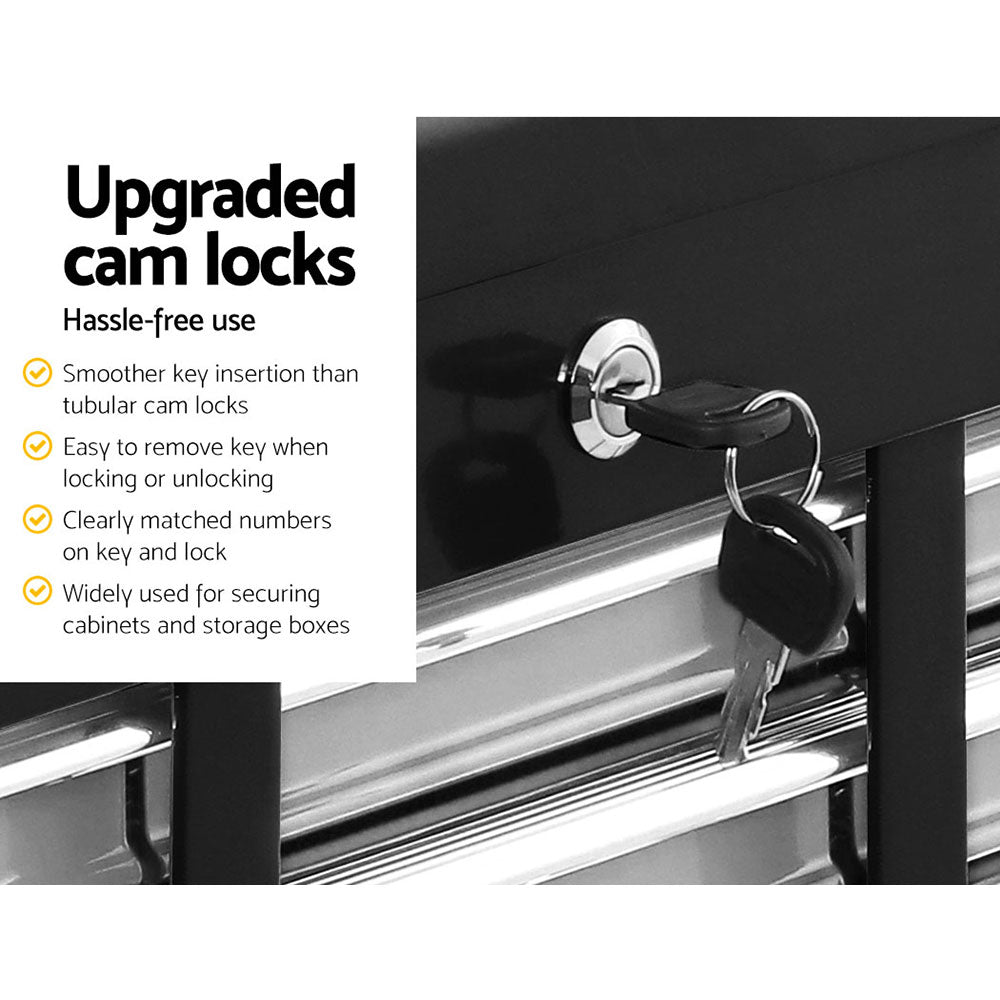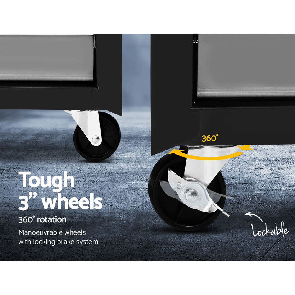 This robust, multi-drawer Marlook Tool Trolley is an essential for any workshop. Crafted from durable steel, it features smooth ball-bearing slides for easy access and a secure lock system for safety. Its spacious design includes varying drawer sizes to accommodate tools of all shapes, complete with non-slip liners. The chest is also mounted on omni-directional castors with locakble front wheels, ensuring a smooth maneuverability and stable positioning. Sleek and functional, it's perfect for organizing and protecting your valuable tools.