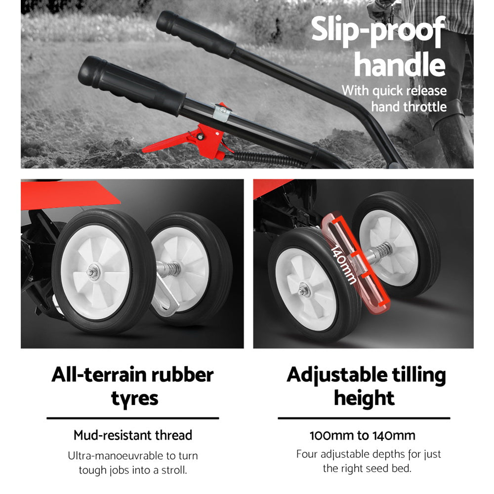 Get the earth moving quick and easy with the Marlook Hand-held Tiller. Featuring a 88cc 10,000rpm 2-stroke petrol motor, the tiller churns out soil deep and wide with its 24 teeth of hardened steel tines. The 4 blades allows you to till an extra-wide swath of 400mm and up to 150mm in depth. In other words, you only need one pass with the tiller to pulverise the soil and get the right seedbed for your favourite crops. Operating the tiller is just as easy with its pull-start improved engine, steady handle and quick-release hand throttle control and all-terrain rubber tyres to transform back-breaking tilling work into a ground-breaking stroll. And when the tilling is done, just fold away the tiller and store with the rest of your tools. Ideal for the home gardener or small-scale commercial grower. This item comes with 1 year warranty.