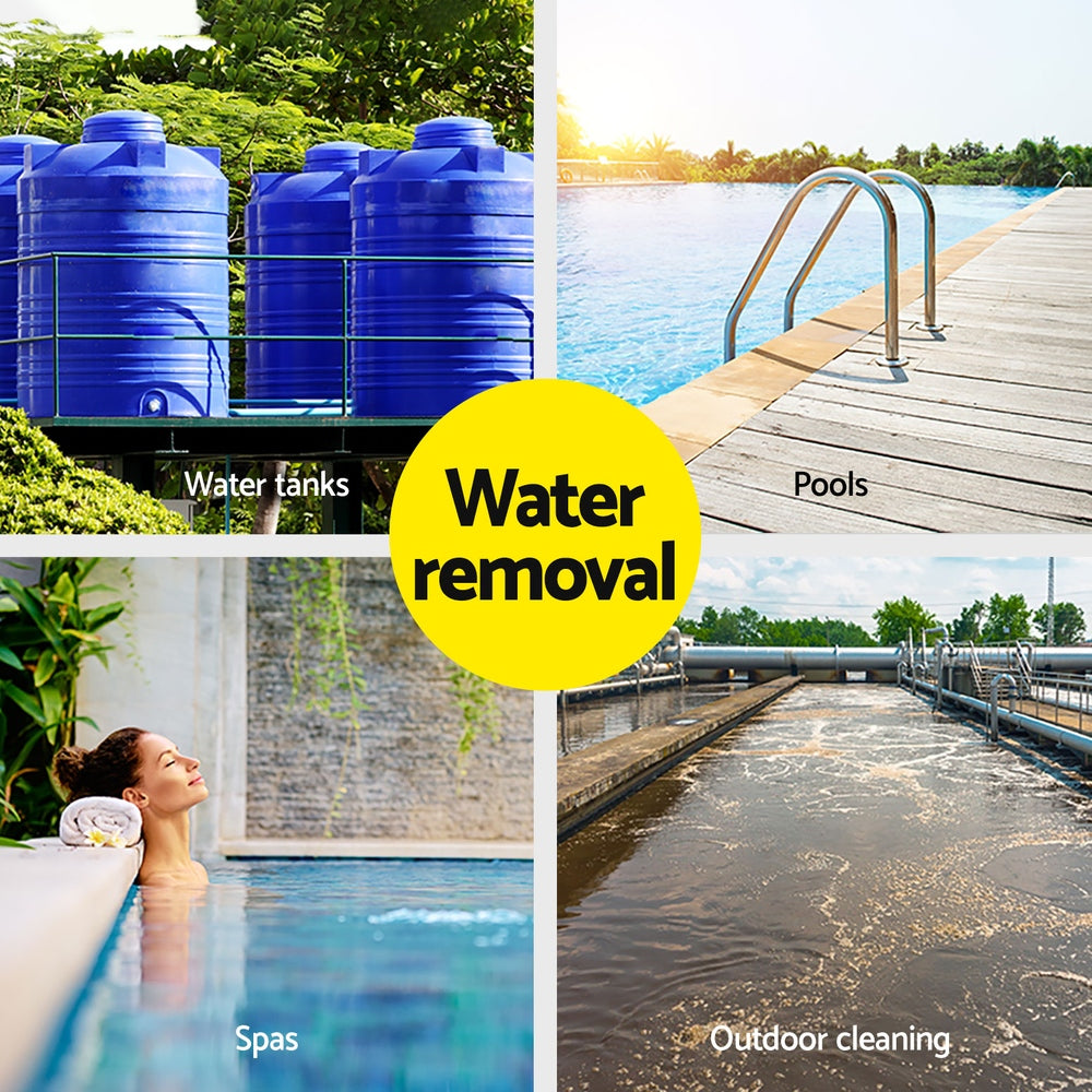 Empty pools, ponds, spas or flooded areas with a Marlook Submersible pump. Submersible pumps are perfect for a variety of situations, from setting up a home irrigation system to quickly draining ponds, tanks, pools or flooded areas. The motor runs quietly and efficiently, and it can be submerged to a depth of seven metres. The pump can operate automatically between 6-15cm of water and it an expel up to 7000 litres of water per hour. It is designed to work with dirty water, with a maximum solid passage of 3mm, so you can work in areas with muddy, sandy, or otherwise contaminated water. Finally, work anywhere thanks to its portable design that includes a 10m cable with a standard AU plug.