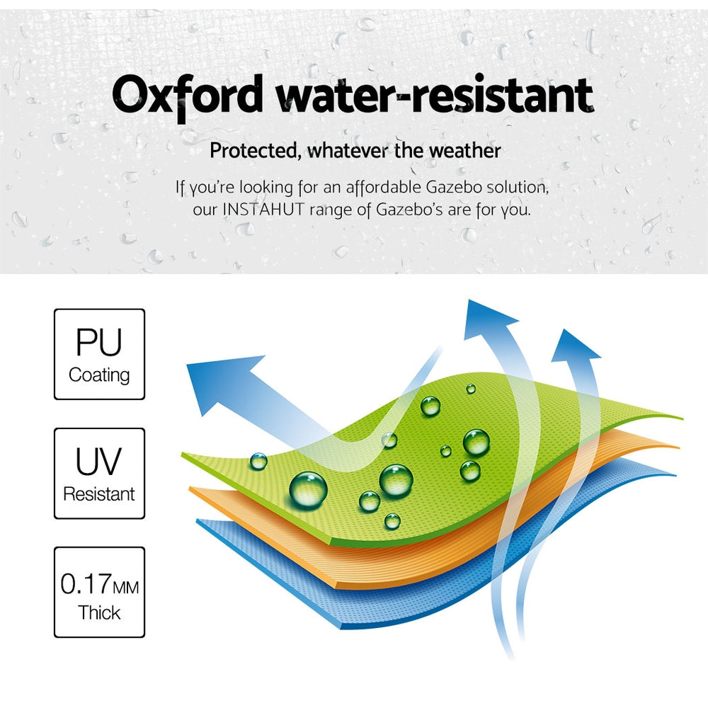 Featuring high density, long lasting PU-coating oxford fabric with effective UV and water repellent treatments, this Marlook 3X4.5 Pop Up Gazebo provides a lovely ground and canopy coverage of 450 x 300cm. It is perfect for all your upcoming outdoor activities, as a sunshade station as well as a shelter for unexpected rains.