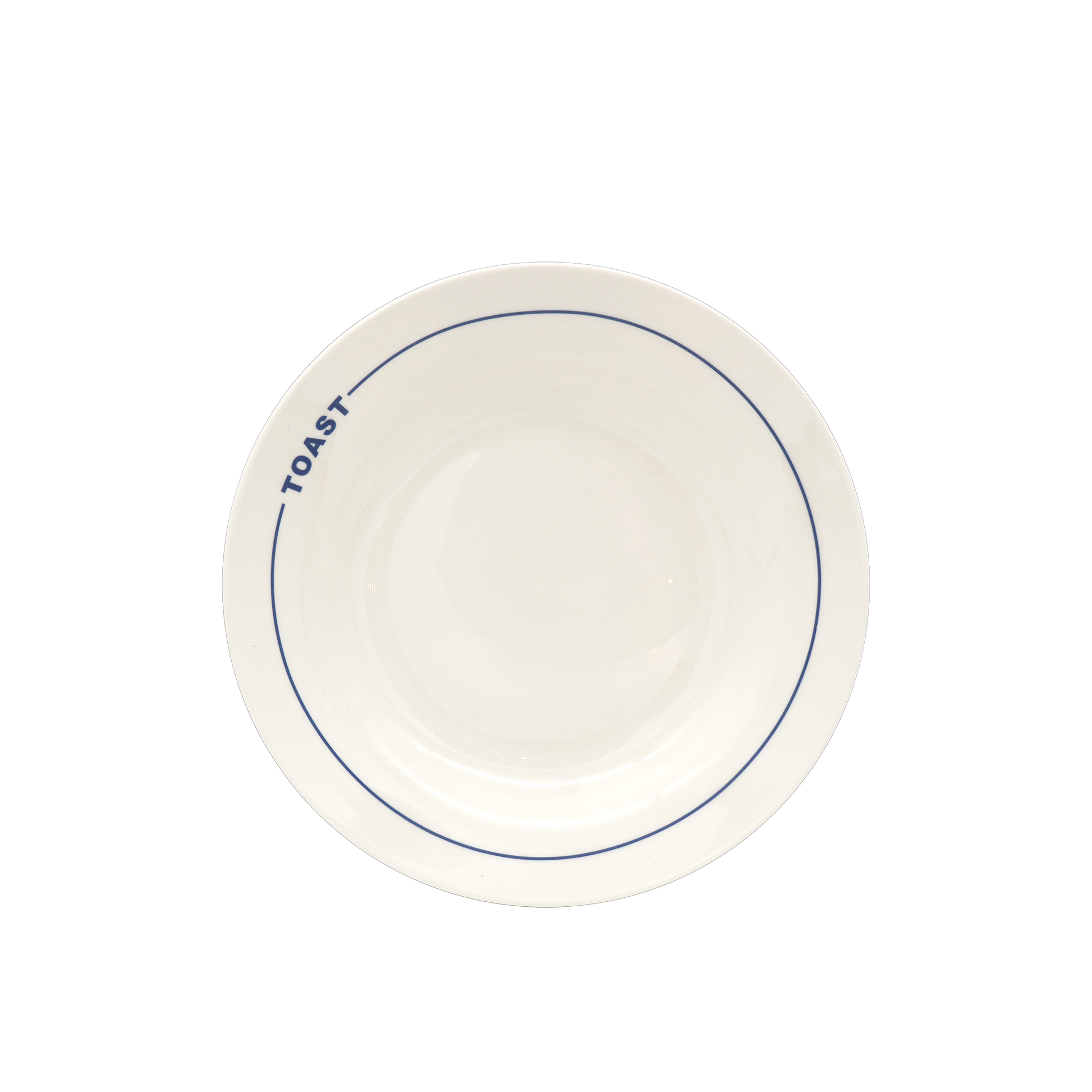 This porcelain plate is an exceptional showcase of innovative minimalist design and traditional crafting methods. It features with an ivory colour background a blue bands around the edge, which is suitable for most tabletop environments.