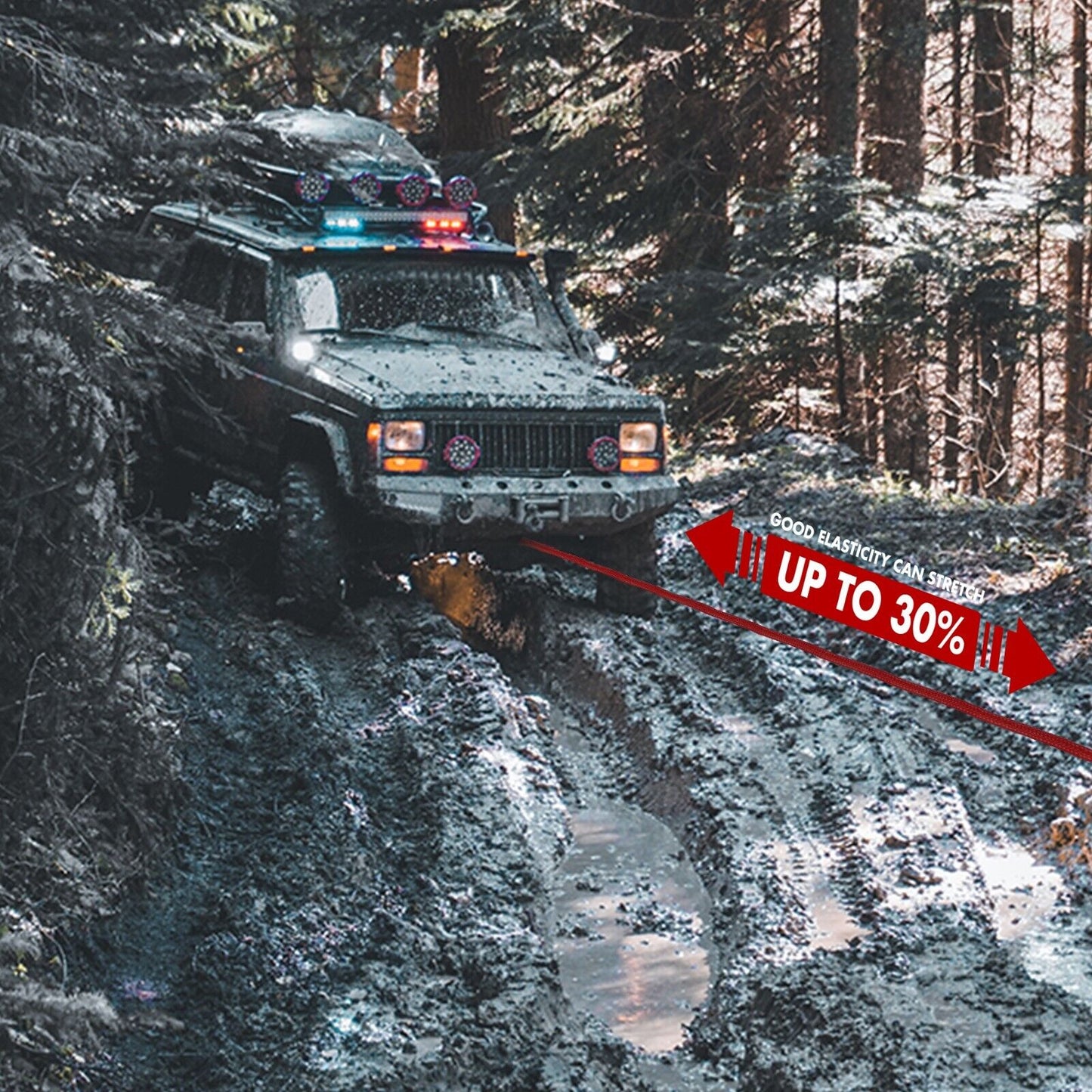The maximum stretch of elastic rope can be 30%, which can break the mud suction while effectively reducing the impact load on the vehicle. The dynamic nature of the rope can also effectively store energy; The strong material coating and the strengthening of the eye ring connecting the fixed points make it have sufficient wear resistance and effective protection of the inner core, increasing the service life by at least 50%